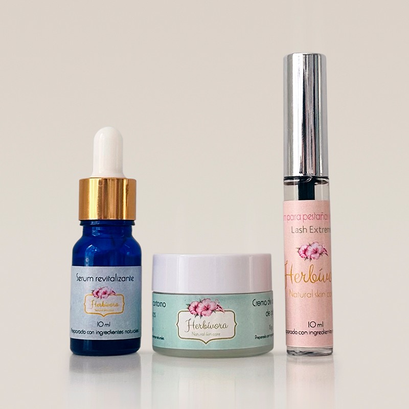 Sérum revitalizante – Hidrata y rejuvenece la piel del contorno de ojos. Contorno de ojos – Reduce ojeras, bolsas y líneas de expresión. Lash Extreme – Fortalece y estimula el crecimiento de las pestañas.
